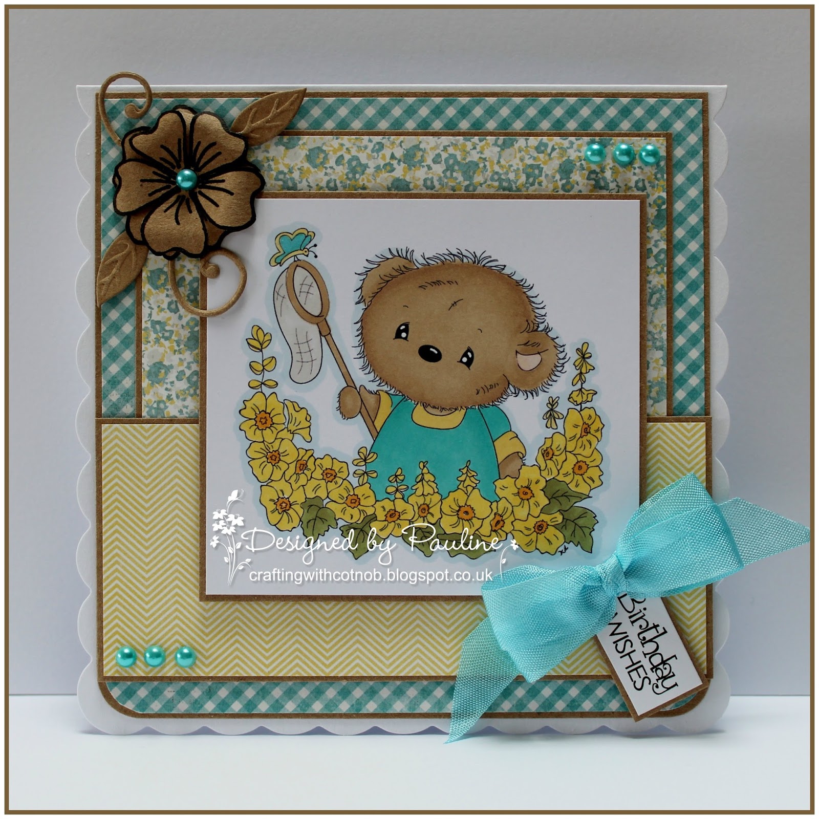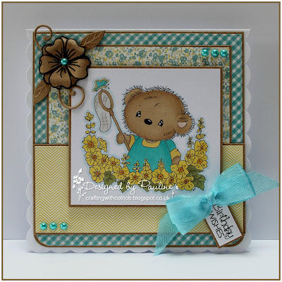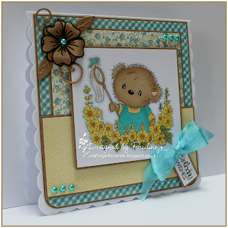 I have used cream card stock and papers from the My Minds Eye Lost & Found paper pad. The flowers were cut with Joy Crafts Flower dies and the sentiment is a Marianne Design Sentiment die. I used an Impression Obsession background stamp and Memento Rich Cocoa ink to create the striped papers.